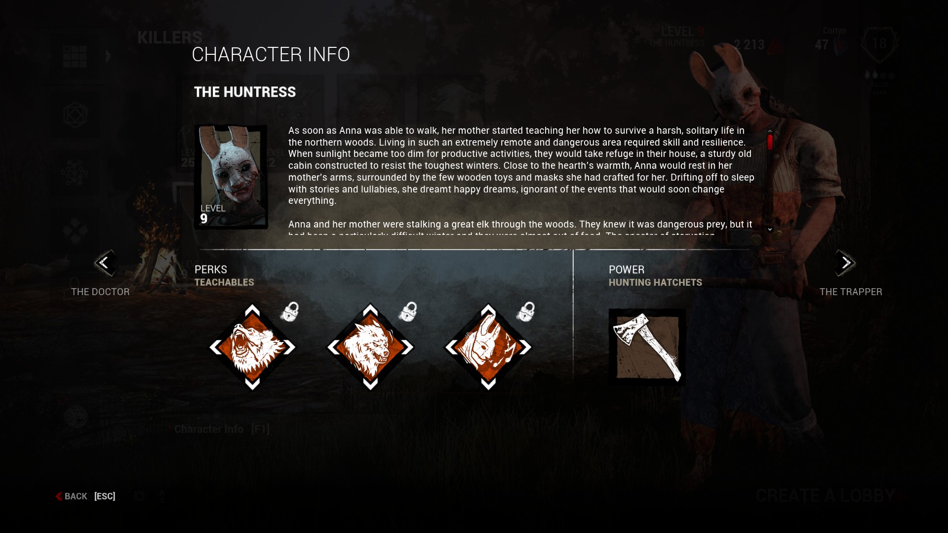 Der neue Killer ist die Huntress und die hat eine ziemlich düstere Geschichte. Schon als kleines Kind lebte sie mit ihrer Mutter im Wald und ernährte sich von dem, was die Natur ihr gab. Sie hatten ein kleines Haus, jagten viel und aßen Beeren. Doch eines Tages jagten sie zusammen einen großen Elch. Sie wussten, dass das Tier gefährlich war, aber die Nahrung war knapp und der Hunger groß. Obwohl der Elch starb, wurde auch die Mutter stark verwundet. Während sie langsam ihr Leben aushauchte und ihr Körper kälter wurde, sang sie ihrer Tochter ein letztes Mal ihr Lieblingslied vor.